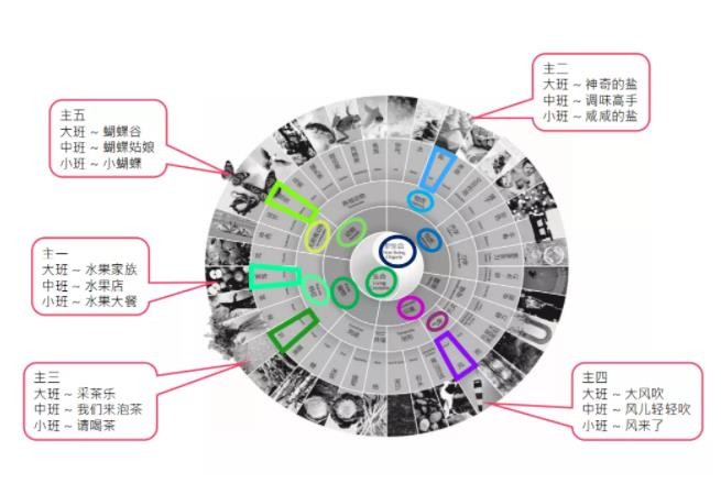 以自然是文化的根源,科学是文明的过程,教育是文化的传承。三年一个系统规划,小班以主题物和家和学校关系,中班以主题物和社区关系,大班是主题物和大自然大社会关系。2022年3月主题小班是《水果大餐》、中班《水果店》、大班《水果家族》是从我们生活中常见常吃到的各种水果进入;第二主题小班《咸咸的盐》、中班《调味高手》、大班《神奇的盐》认识水果的保存方式及生活中的各种调味品,盐与人类生活的密切关系;第三主题小班《请喝茶》、中班《我们来泡茶》、大班《采茶乐》是有生命的植物的叶子,叶子对人类生活的重要性;第四主题,小班《风来了》、中班《风儿轻轻吹》、大班《大风吹》,风带了動力、电力及清凉的空气;第五主题,小班《小蝴蝶》、中班《蝴蝶姑娘》、大班《蝴蝶谷》是昆虫中的蝴蝶,蝴蝶传授花粉,它的多彩给人们以精神上的美好享受。