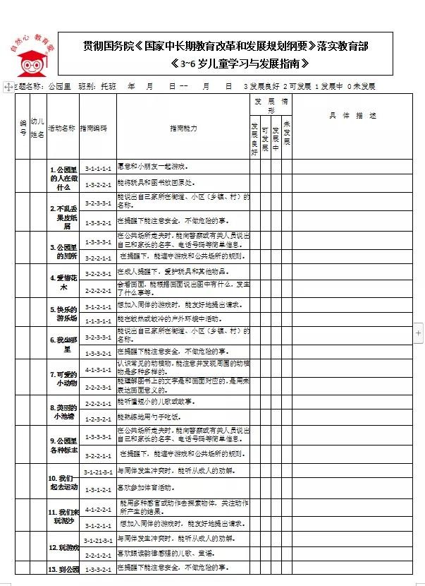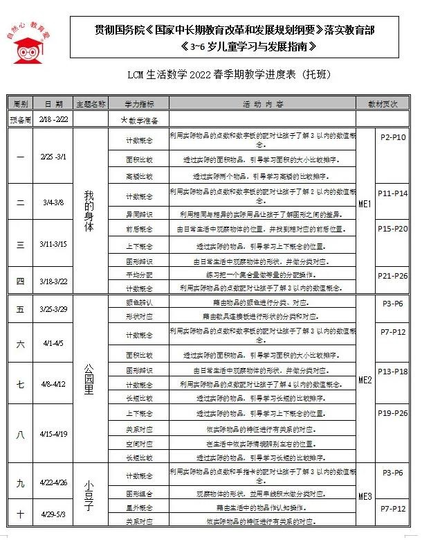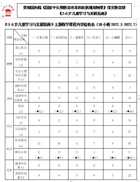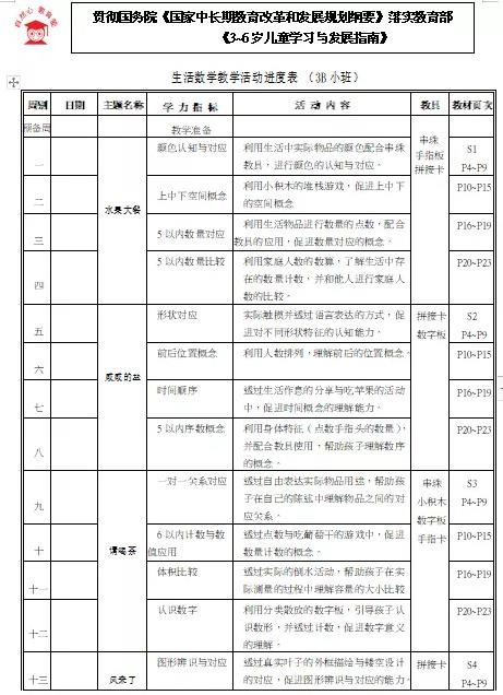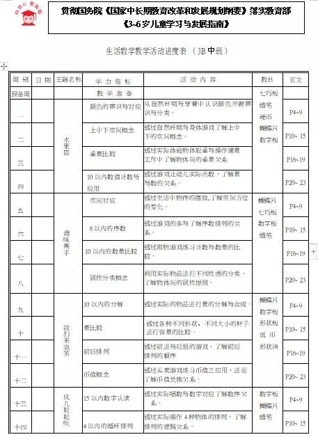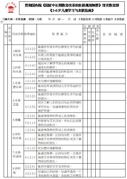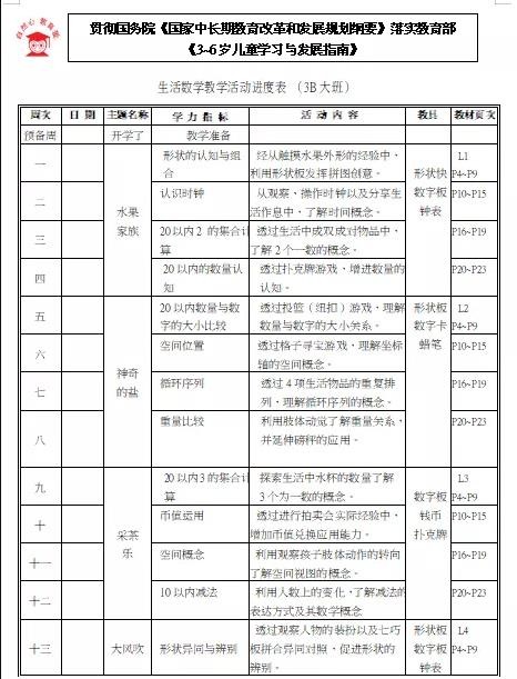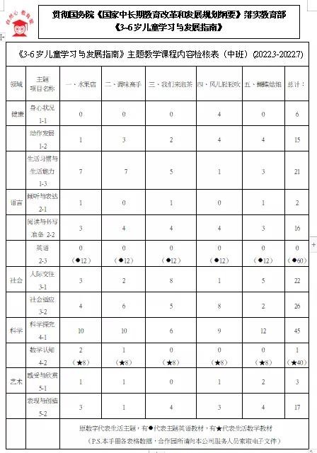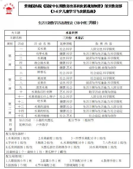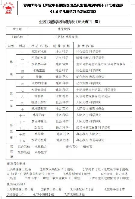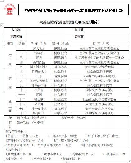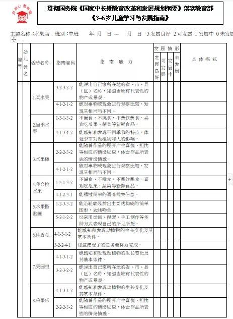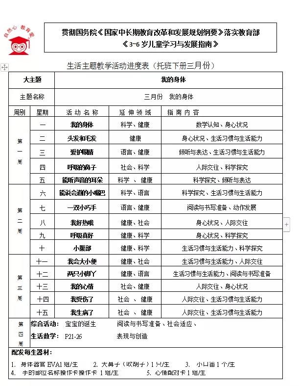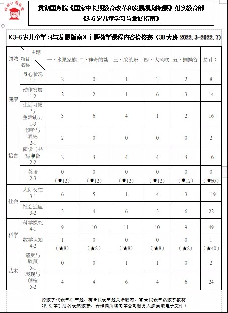 贯彻国务院中长期教育发展纲要战略目标:“以人为本、德育为先、全面发展”每学期均提供《3-6 岁儿童学习与发展指南》主题教学课程的进度表、检核表、 评量表。
