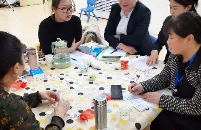 “教具教法培训”。园长、老师们一起集思广益讨论教材教具的玩法。