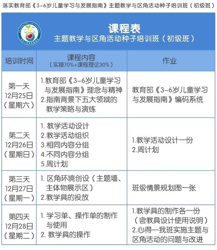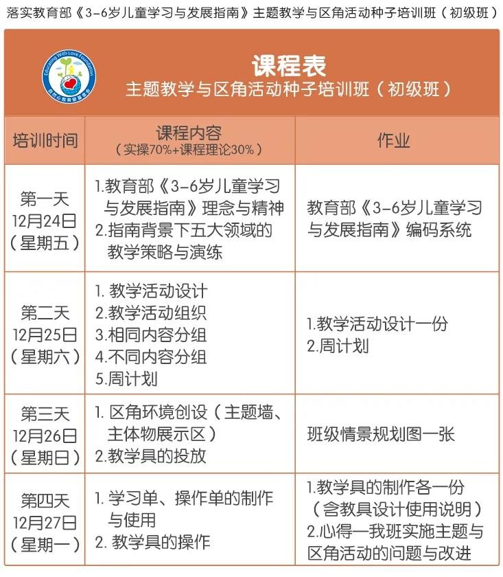 课程是核心,教师是关键。幼儿园的持续发展离不开优质专业的师资团队。优质专业的教师必须自身具备丰富的知识结构、较高的专业能力以及对幼教行业抱有持续的热情。幼儿园教师是幼儿园教育教学方面的中坚力量,需要不断更新教育观念,掌握幼儿教育的新理念、新知识、新技能和新方法,面对不同类型的教师。自然心教育爱特开设12月初级、中级种子培训班。
